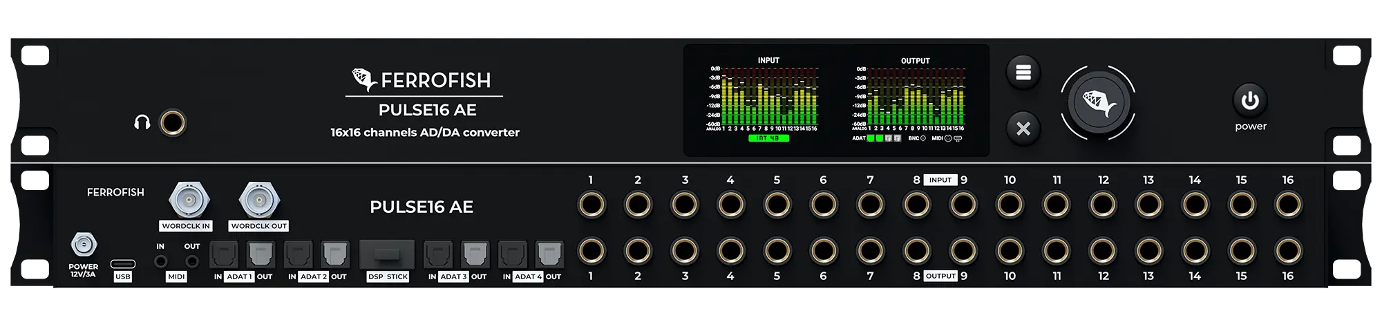 The Ferrofish PULSE16 AE is a versatile, compact AD/DA converter that seamlessly integrates into studio and live setups. It has 16 high-quality balanced analog inputs and outputs to ensure precise, clean signal conversion. Its clear front-panel displays offer complete visual control, simplifying real-time monitoring and configuration. Designed for professional workflows, the PULSE16 AE's robust clocking options and compatibility with standard studio connections make it an indispensable tool for sound engineers seeking reliable performance in a 19-inch, 1U rack form factor.